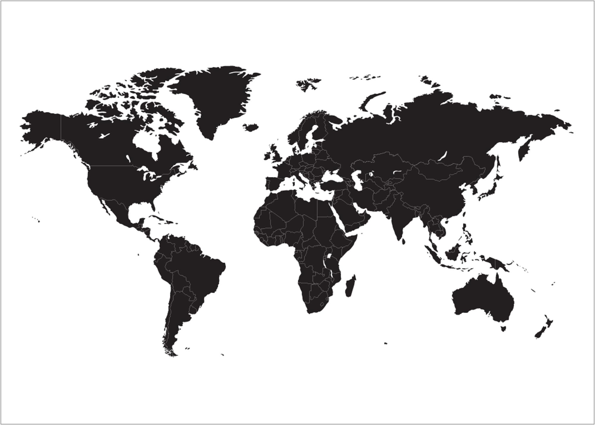 Elegáns fekete-fehér világtérkép, amelyen a kontinensek fekete színnel vannak ábrázolva, az országokat pedig vékony fehér vonalak jelölik. A grafikus poszter ugyanolyan jól mutat modern, minimalista környezetben, mint a klasszikus bútorokkal berendezett terekben. Válasszon hozzá egy szép keretet, amely illeszkedik a többi belső térhez, hogy a kép beilleszkedjen az összképbe, vagy keretezze be a térképet olyan kerettel, amely valóban kiemeli a motívumot és kiemeli a falon.
