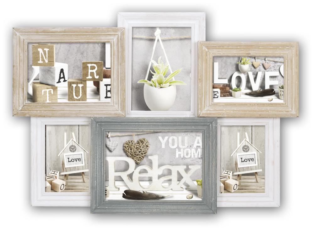 Hadd, hogy ez a bájos kollázskeret természetközeli és nyugodt érzést kölcsönözzön otthonának! A keret 6 különböző formátumú képnek ad helyet. A lécek faszínűek, szürkék és fehérek, kopott részletekkel.