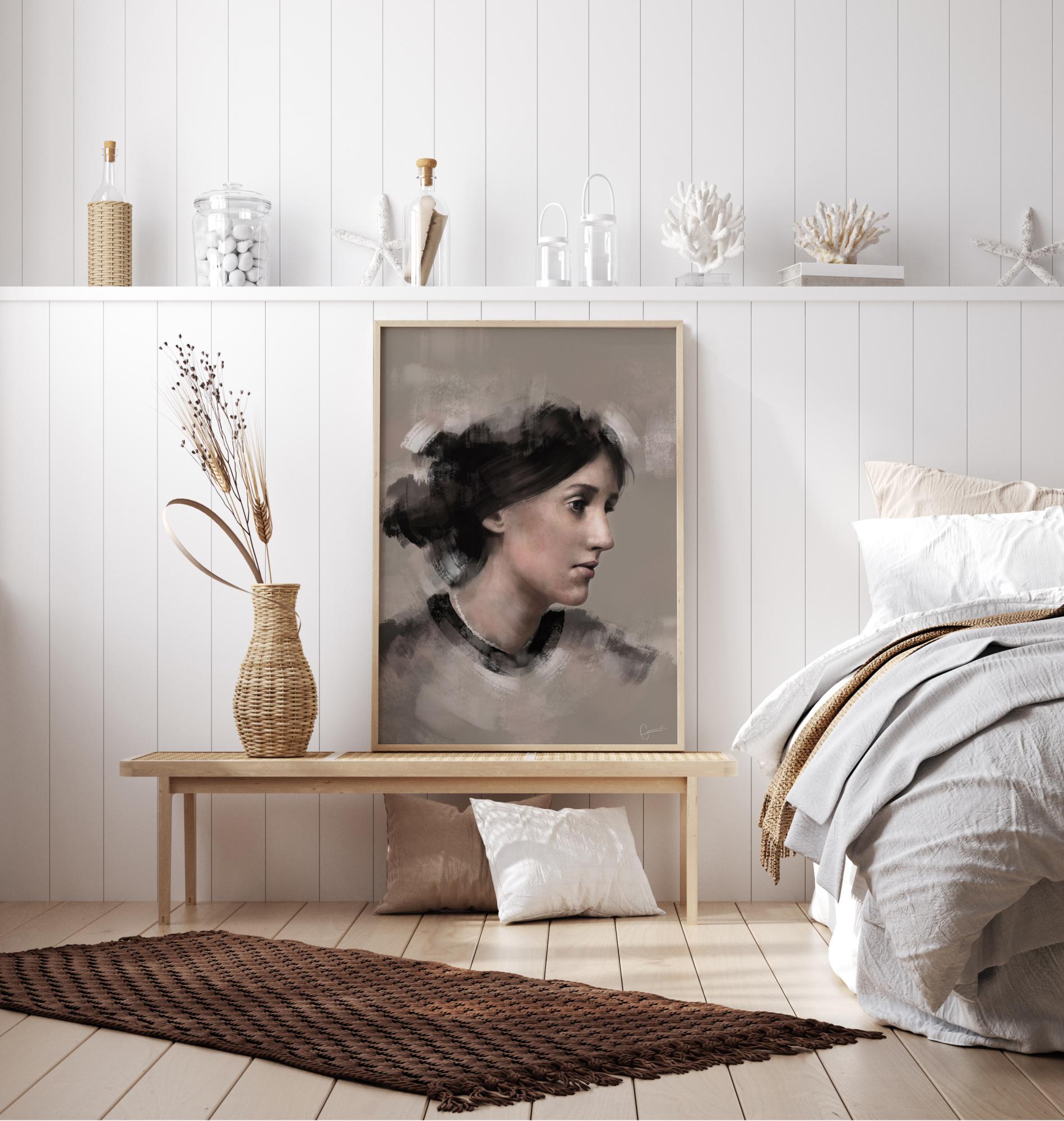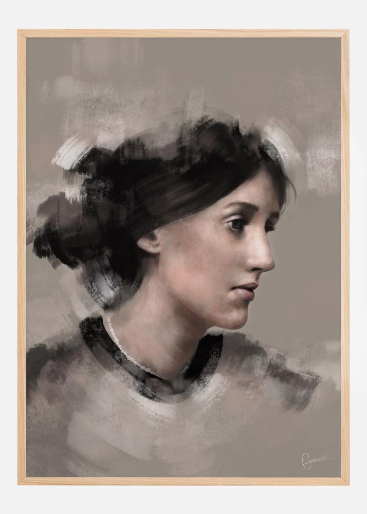 Egy portréposzter Virginia Woolf profiljával. A haja egyszerű, lágy színfoltok, de az arca részletesen van kidolgozva. A portré lágy és nőies, szinte melankolikus hangulatot kölcsönöz az arcának, amikor a távolba néz.