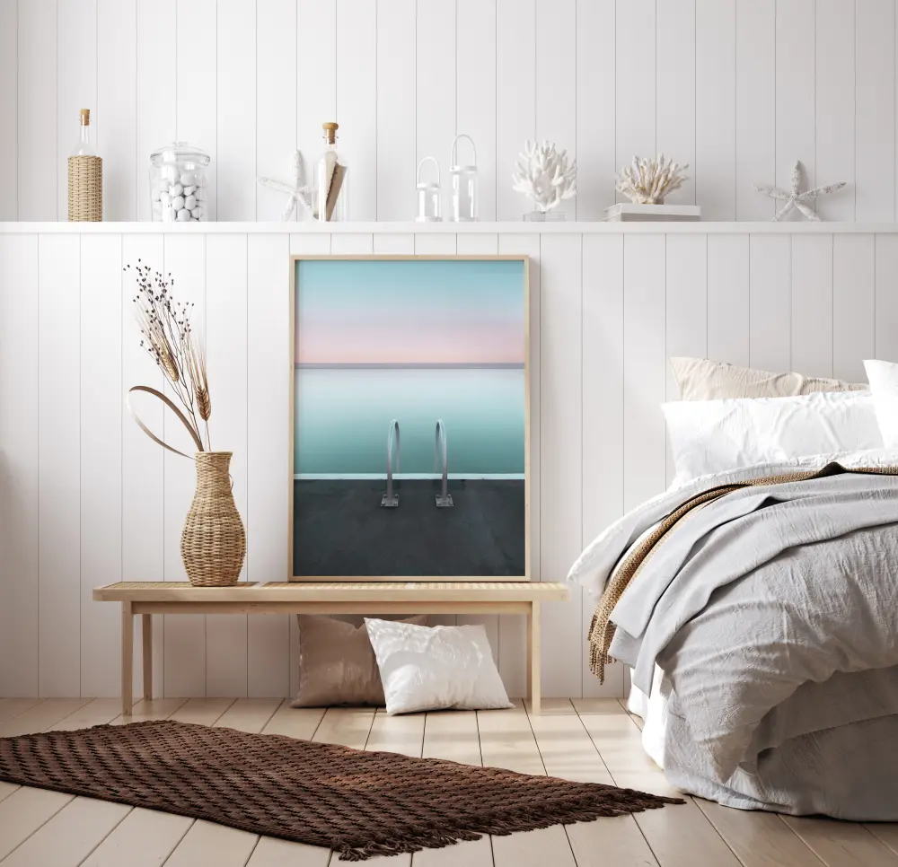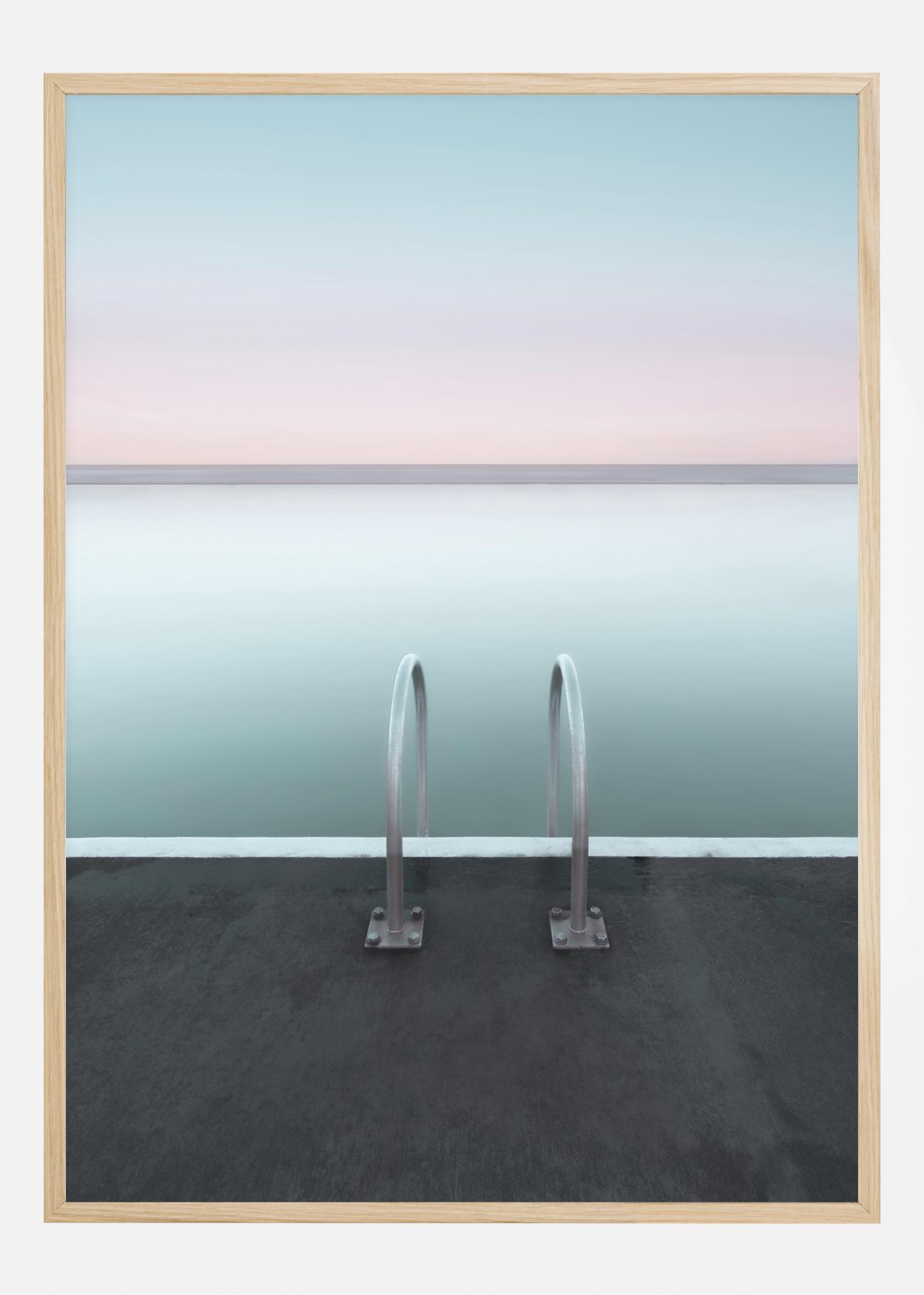 Egy pasztell színű poszter medencelépcsők fogantyúival, amelyek egy platform szélén át a hatalmas kék tengerbe vezetnek. A fogantyúk csábítóak, és arra ösztönöznek, hogy kövesd őket a peremen túl a hatalmas kék vízbe. A háttérben lágy halvány rózsaszín égbolt látható, ahogy a korai reggeli fény megérkezik.