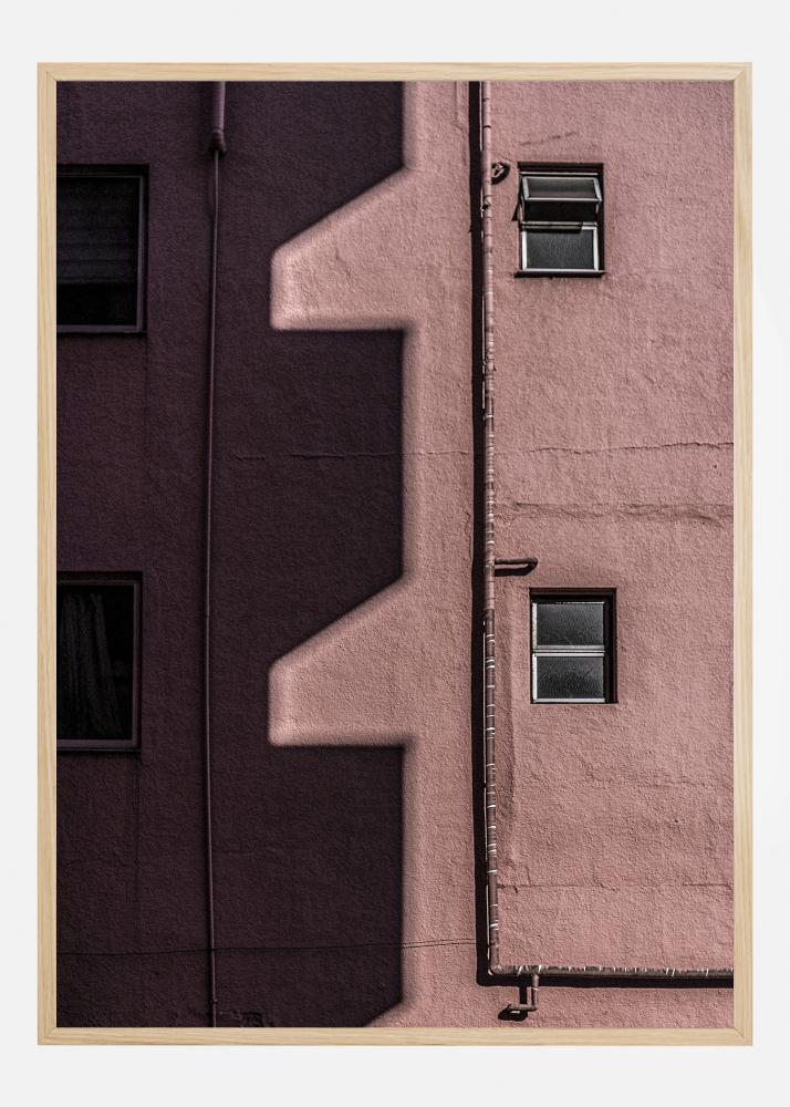Egy épületi poszter egy sötétrózsaszín épület külsejével. Árnyékok és fények furcsa formákat vetnek az épület oldalára. Az ablakok úgy néznek ki, mint a szemek, amelyek vonalba állnak az árnyékokkal, amelyek orroknak tűnnek, így ez a kép visszanéz rád.
