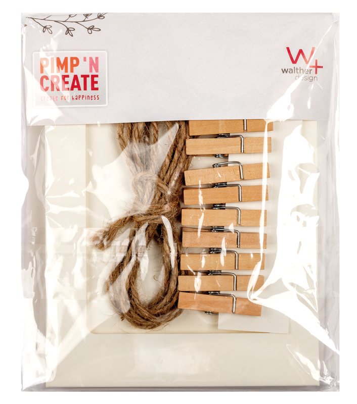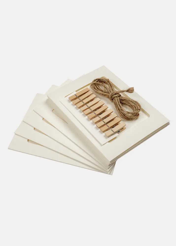 Fotógirland 10 papírkerettel bézs árnyalatban, 10x15 cm-es fotókhoz. A girland hossza 180 cm, és 10 fából készült csipesze van a jutazsinórra rögzítéshez. A papír képkeretek bevonat nélküliek, ami lehetővé teszi, hogy átfested vagy díszítsd őket, ahogy szeretnéd.