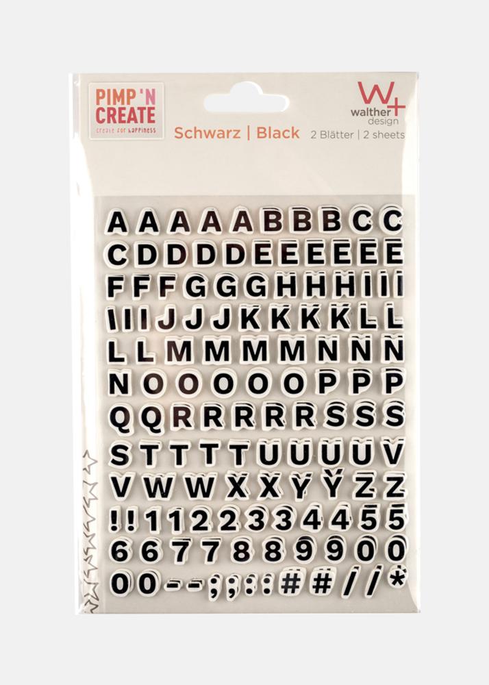A betűk 1 cm nagyságúak és elegáns fekete kialakításúak. A csomagolás 2 ívet tartalmaz, amelyen 126 betű, szám és speciális karakter található.