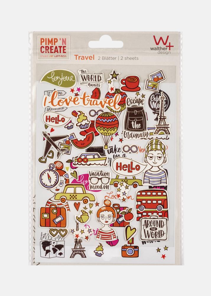 Öntapadós matricák utazási motívumokkal. Tökéletes kreatív fényképalbumok tervezéséhez, ajándékok díszítéséhez vagy üdvözlőkártyák készítéséhez. A csomag tartalmaz 1 lap 3D matricát és 1 lap sima matricát.
