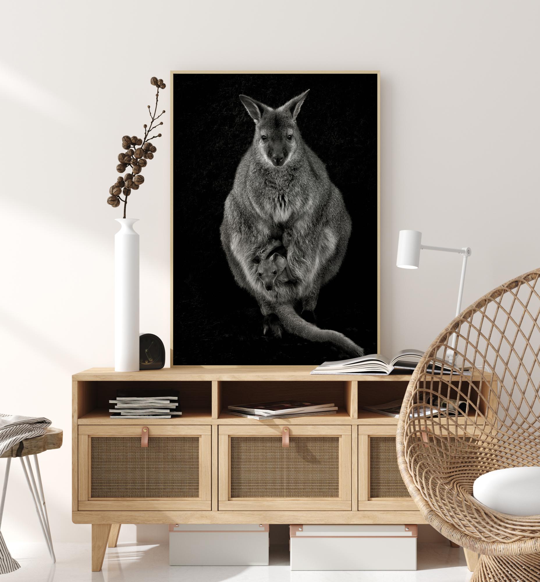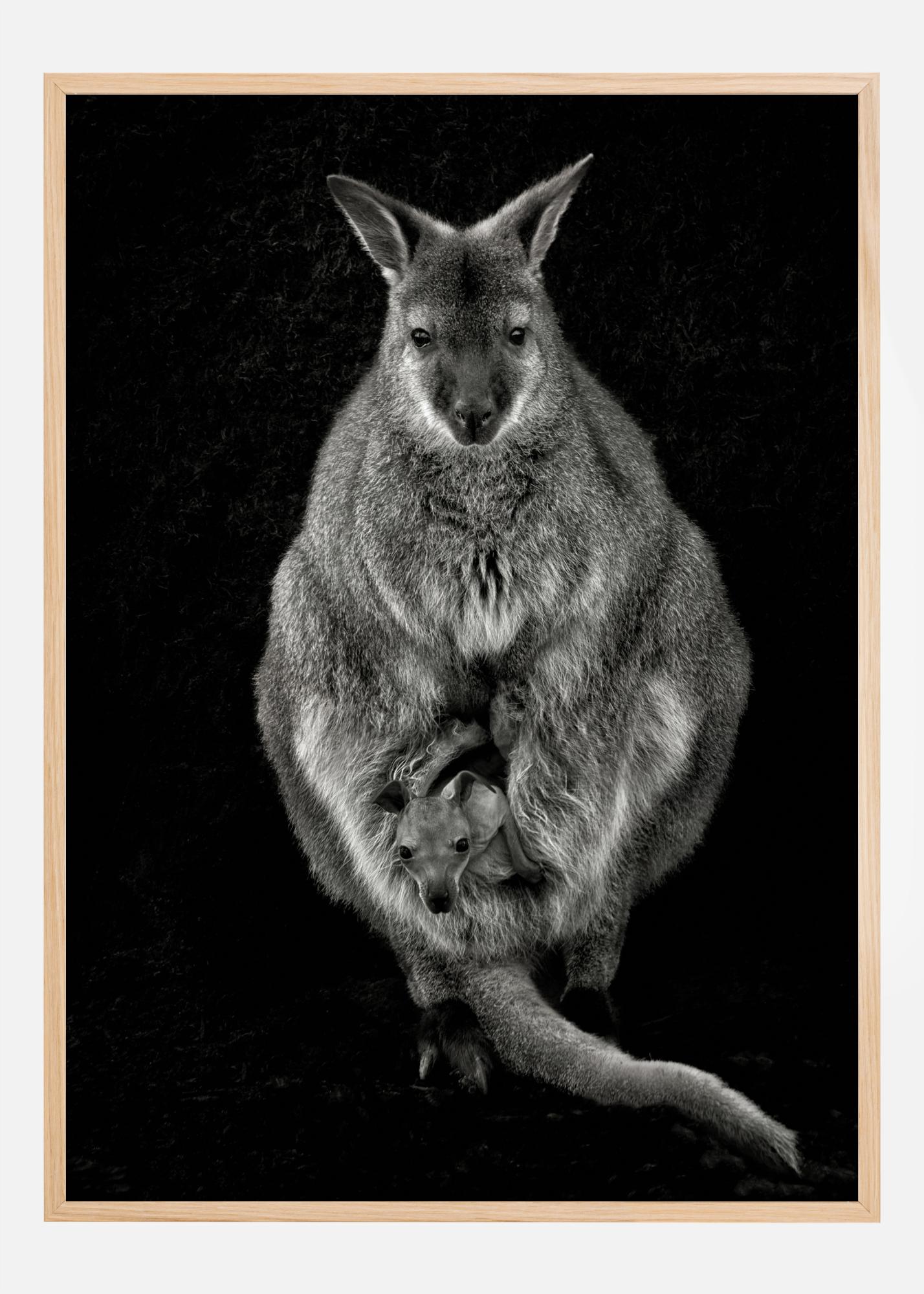 Egy természetplakát egy wallabyval és a kicsinyével. A pár egy csodálatos képen emelkedik ki fekete háttér előtt. Érezze azt a bájos, gyengéd érzést, amikor megnézi ezt az anyát és gyermekét.