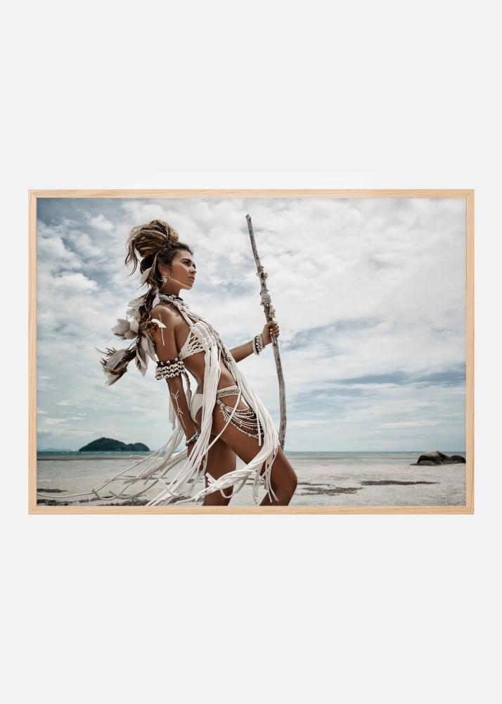 Egy harcos poszter egy fiatal nővel, aki világos törzsi ruhában pózol egy tengerparton. Leégett bőre kontrasztot alkot a testét borító fehér áramló ruhákkal és ékszerekkel, amelyek hajában tekeregnek. Erőteljes pózát tovább hangsúlyozza a bal kezében tartott hosszú bot, miközben ellenségeire mered.