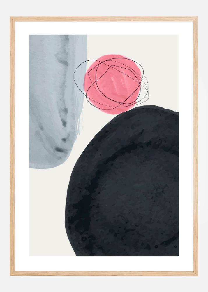 Egy élénk absztrakt poszter nagy formákkal, amelyek kitöltik az egész képet. Egy nagy fekete kör kitölti a jobb alsó sarkot. Fölötte van egy kis rózsaszín kör vékony fekete vonalakkal, amelyek körülölelik, hogy spirálokat hozzanak létre. Egy utolsó világoskék forma lóg le a bal felső oldalról.