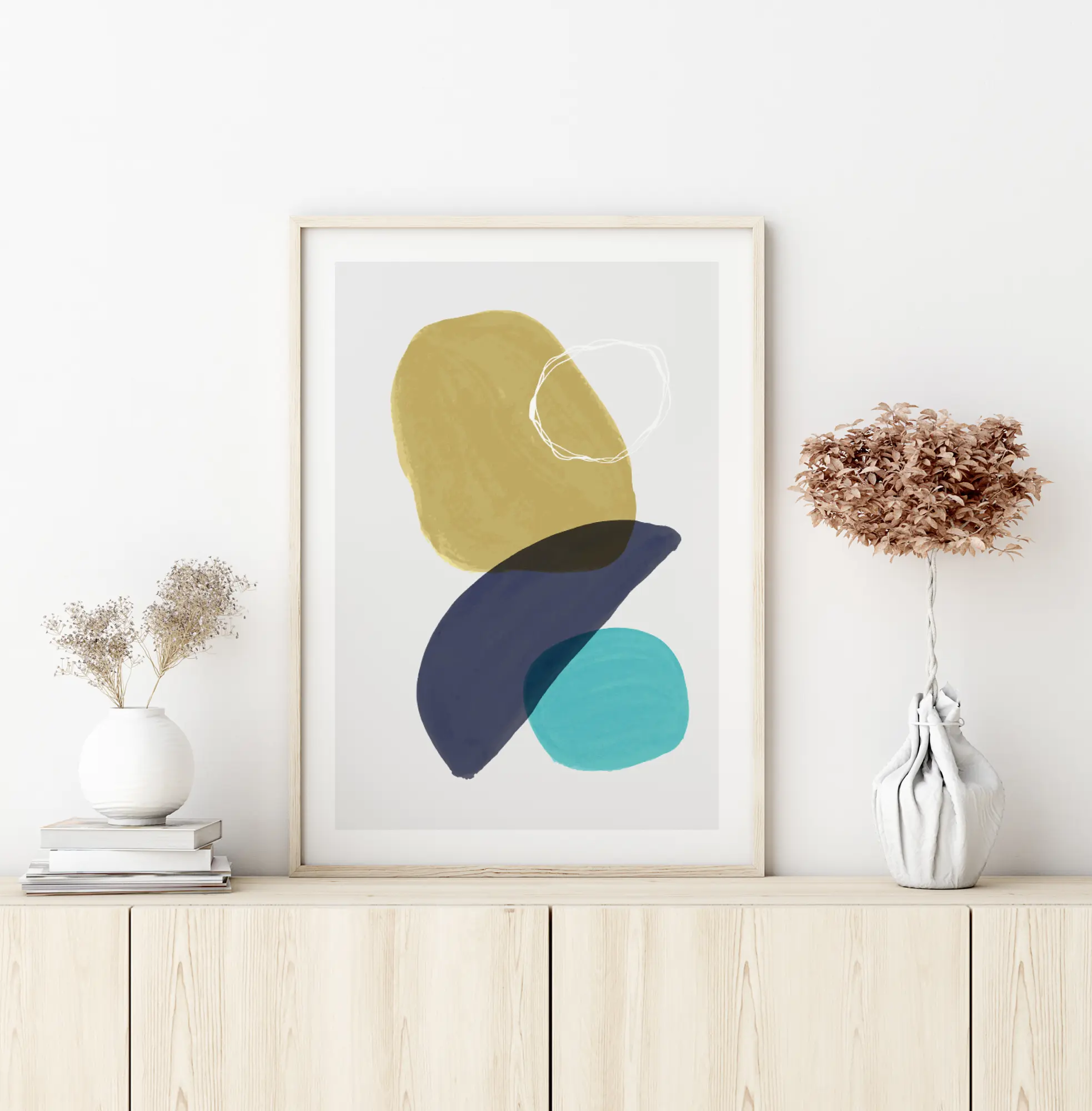 Egy absztrakt poszter különféle formákkal különböző színekben. Egy világoskék kör van az alján. Felett egy kék félkör és fölötte egy bézs körforma, mindez egy szürke háttéren. A vidám, élénk formák alkotják ezt a meggyőző képet, amely bármely helyiséget felderít otthonodban.