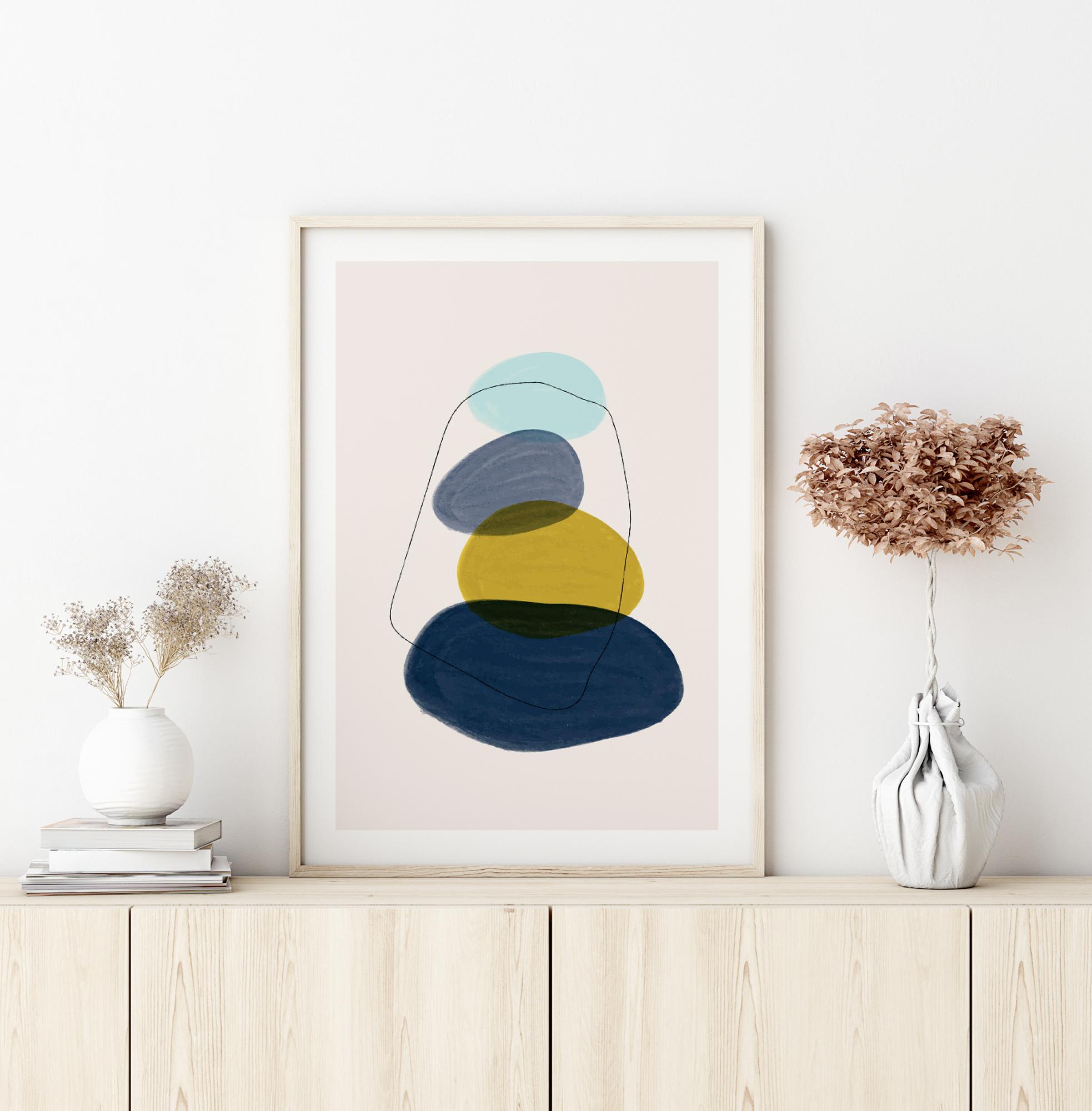 Egy szórakoztató absztrakt poszter különböző kerek formákkal, amelyek úgy néznek ki, mint a kövek. A formák nagyokkal kezdődnek, és fokozatosan kisebbek lesznek, ahogy egymásra helyezkednek ebben a szórakoztató képen. A sötétkék, világoskék és sárga színek ebben a képben fényes és felemelő munkává teszik ezt otthonod számára.
