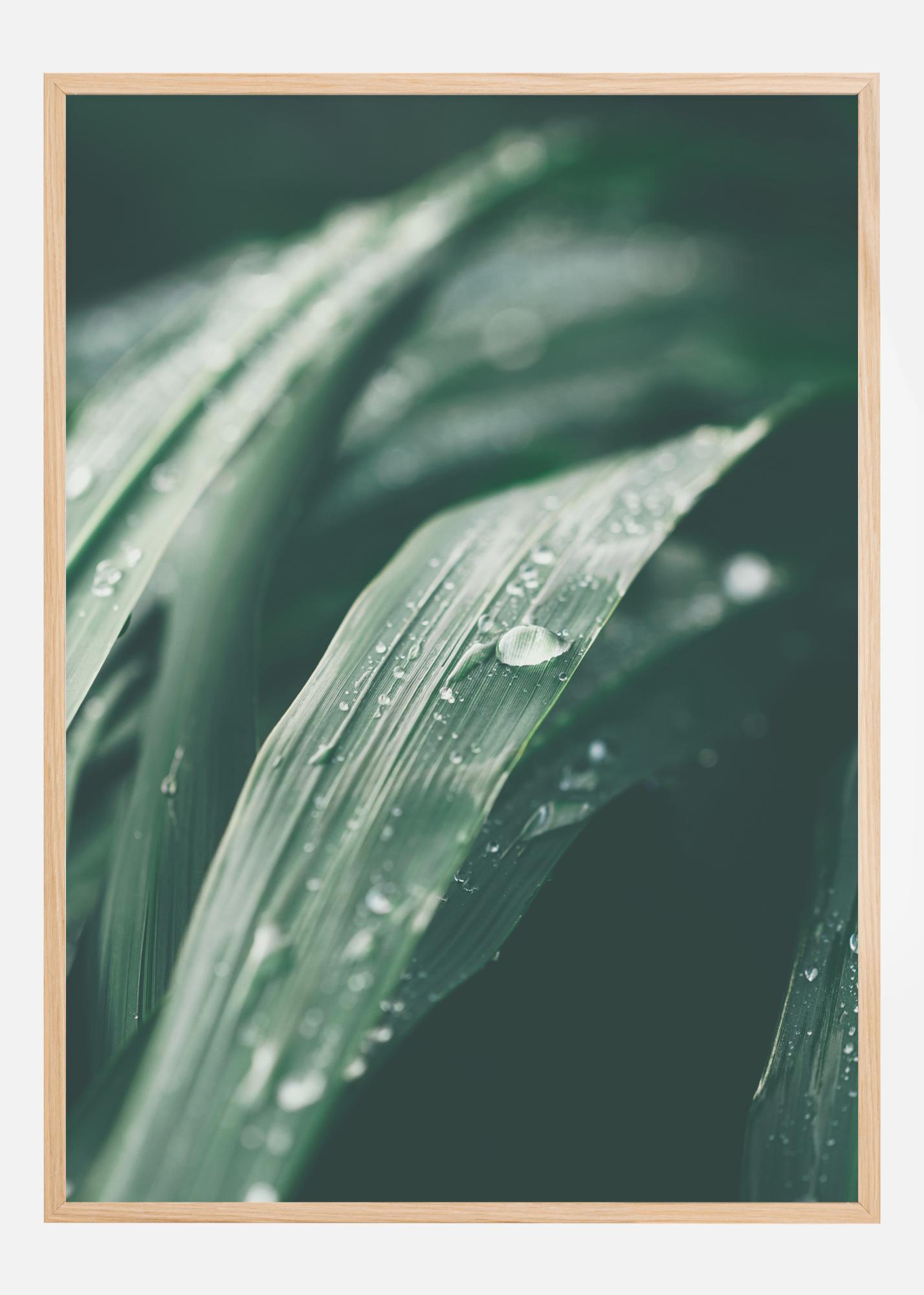 Makrofotó levelekkel és vízcseppekkel. A sötétzöld levelek éles részletekben tölti meg a képet ereikkel. A vízcseppek követik a levelek íveit, és lecsöpögnek a kép szélei felé. Akaszd fel ezt egy lágy földszínű falra az erdő hangulatáért.