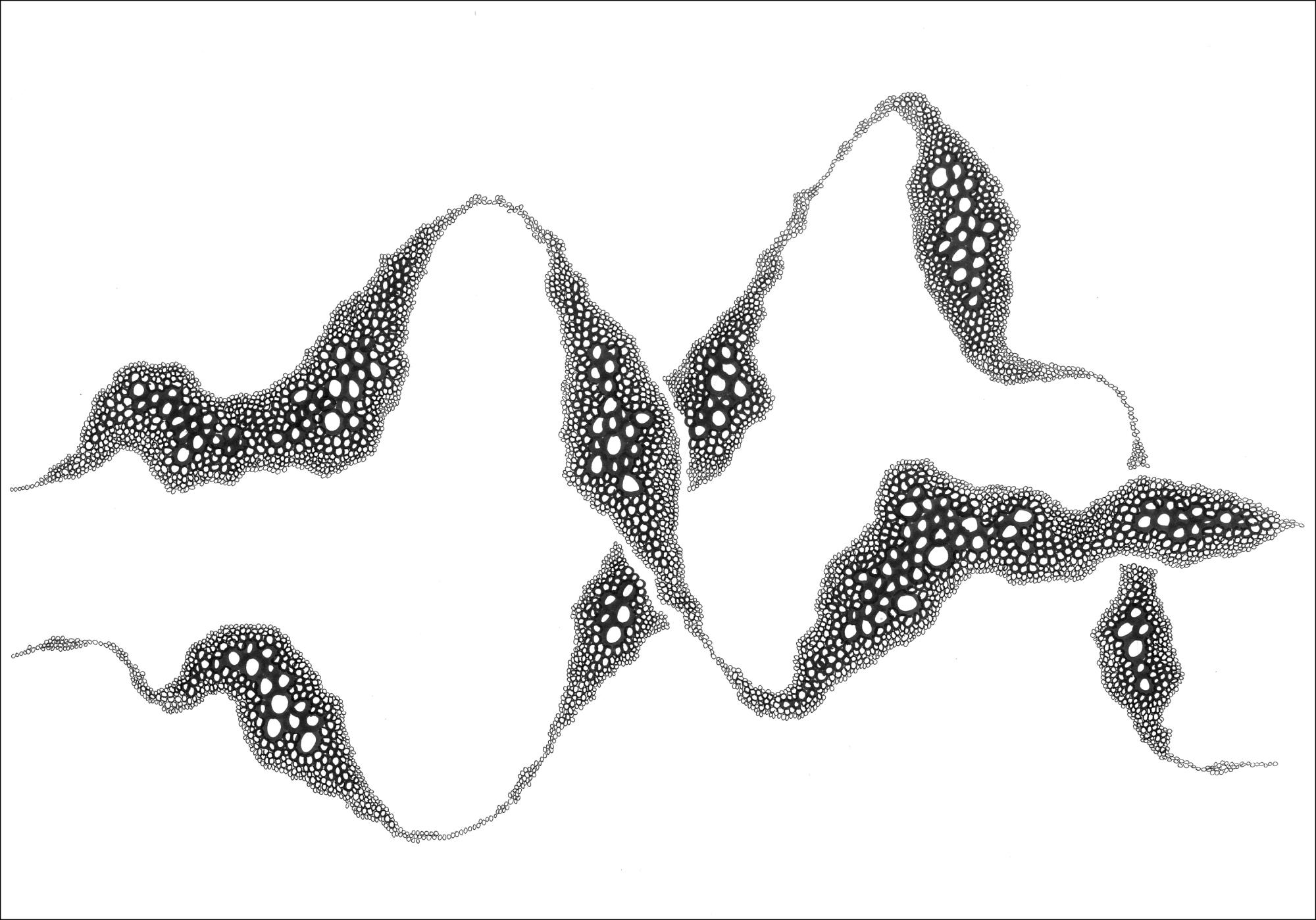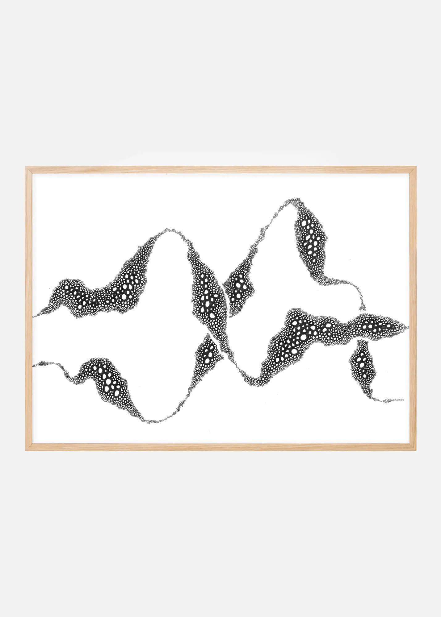 Egy drámai absztrakt poszter különféle fekete és fehér körökkel, amelyek furcsa hullámzó hullámokat hoznak létre egy fehér háttér előtt. Vannak nagy és kicsi körök, mint buborékok, amelyek hosszú, hullámzó szálakhoz vannak rögzítve, amelyek örvénylenek és kilengenek a kép fölött, és keresztezik egymást ebben a különösen lenyűgöző műalkotásban.