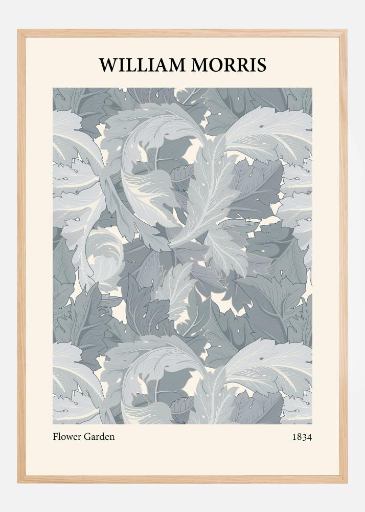 Ez a poszter a buja és kifinomult William Morris-motívumával mind nyugalom, mind klasszikus elegancia érzetét nyújtja. A design tisztelgés a gazdag növényvilág előtt, melyet gyakran társítanak Morris-hoz és az Arts and Crafts mozgalomhoz kapcsolódó munkájához. A "Virágos kert" nevű motívum sűrű levelek és virágok kompozícióját tartalmazza, hideg kék és szürke árnyalatokban, krémfehér elemekkel. Minden részlet e poszteren gondosan kidolgozott, ami egy erényes és rendezett kert érzetét kelti.