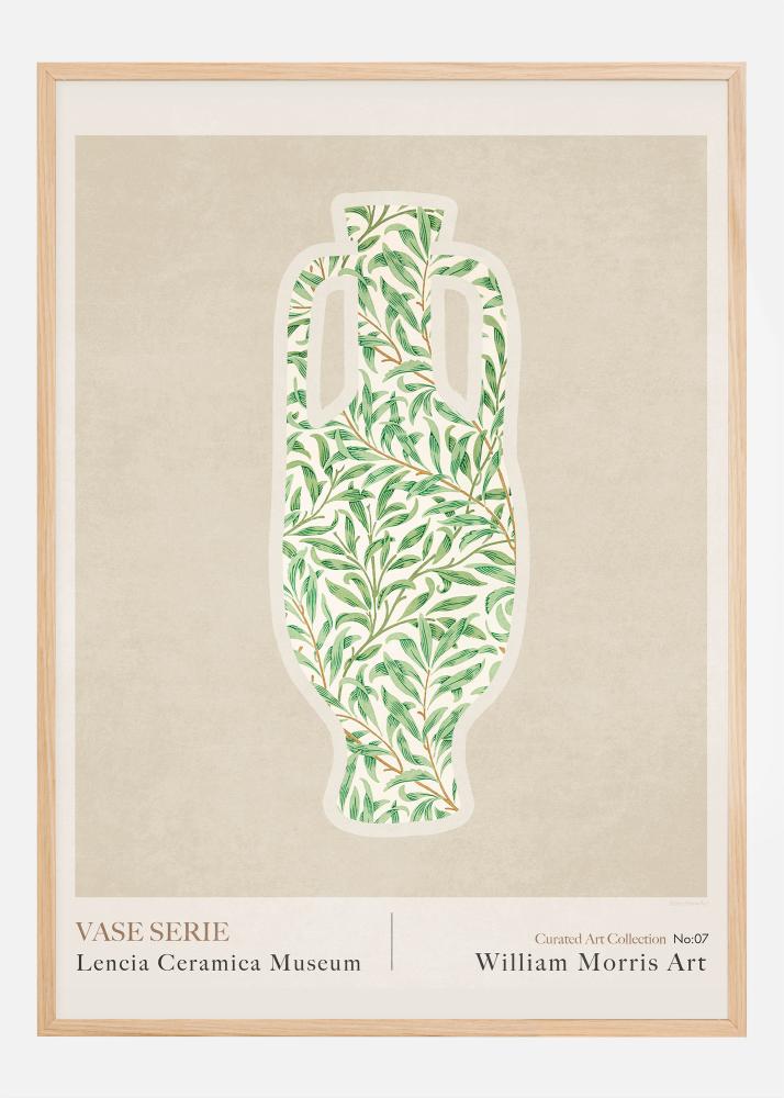 Ez a finom és természet ihlette poszter a "Curated Art Collection" 07-es számú darabja, amely a Lencia Ceramica Múzeumból származik, és William Morris művészi örökségét ünnepli. Egy klasszikus váza sziluettjét ábrázolja, tele Morris jellegzetes zöld növénymintájával, ami bemutatja mesteri módját annak, hogyan kombinálja a formát és a funkciót az esztétikai szépséggel a tervezésben. Ez egy időtlen tisztelgés Morris víziója előtt, és azon képessége előtt, hogy inspirációt merítsen a természetből, és művészetté alakítsa azt.