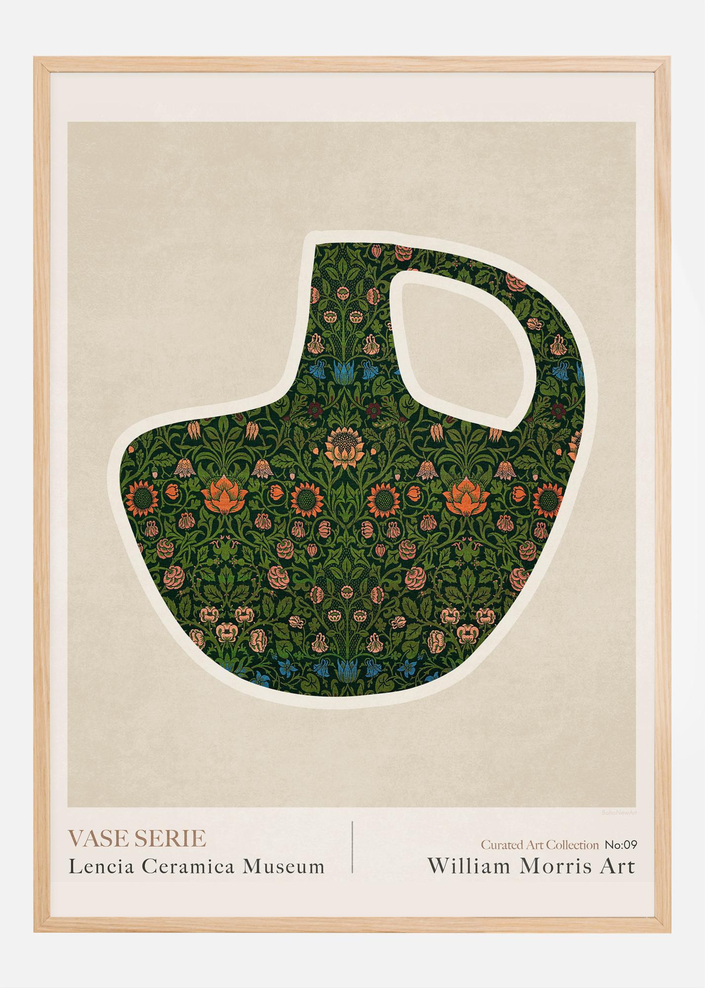 A poszter színvilága mély és meleg, zöld, narancs és rózsaszín árnyalatokkal, amelyek gazdag és összetett palettát alkotnak. Ez a kifinomult színhasználat gyönyörűen kiemelkedik a semleges háttérből, és feltűnően mutat egy egyszerű és tiszta fakeretben (nem része a motívumnak). A Lencia Kerámia Múzeumok váza-sorozatának 09. számú darabjaként ez a plakát tisztelgés William Morris művészete előtt, elegáns és történelmileg kapcsolódó díszítést kínál mindenkinek, aki értékeli a design nagyságát és a természet motívumainak szépségét.