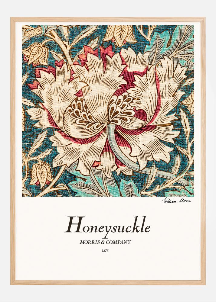 Ez a poszter bemutatja a "Honeysuckle" nevű gyönyörű mintát William Morris tervezésében, amelyet a Morris & Company számára készített 1876-ban. A minta egy gazdag virágszövés, a jerikói lonc hullámzó íveivel és a virágokkal a piros, krém és kék gyönyörű árnyalataiban. A háttér, egy mélyebb kék árnyalatban, kiemeli az elegánsan formált virágokat és leveleket, és egy mély és összetett kompozíciót teremt, amely egyszerre szemet gyönyörködtető és időtlenül szép.