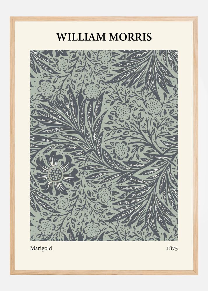 Ez a William Morris plakát a bűvös "Marigold" mintával 1875-ből, Morris egyedi képességét mutatja meg, hogy részletgazdag és harmonikus botanikai illusztrációkat hozzon létre. A motívum tele van élettel és mozgással, kanyargó leveleivel és virágaival mintha magából a papírból nőnének ki. A színek, megnyugtató zöld tónusokban és sötétebb hangsúlyos árnyalatokban, egy elegáns és ugyanakkor természethű benyomást keltenek.