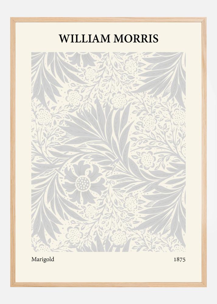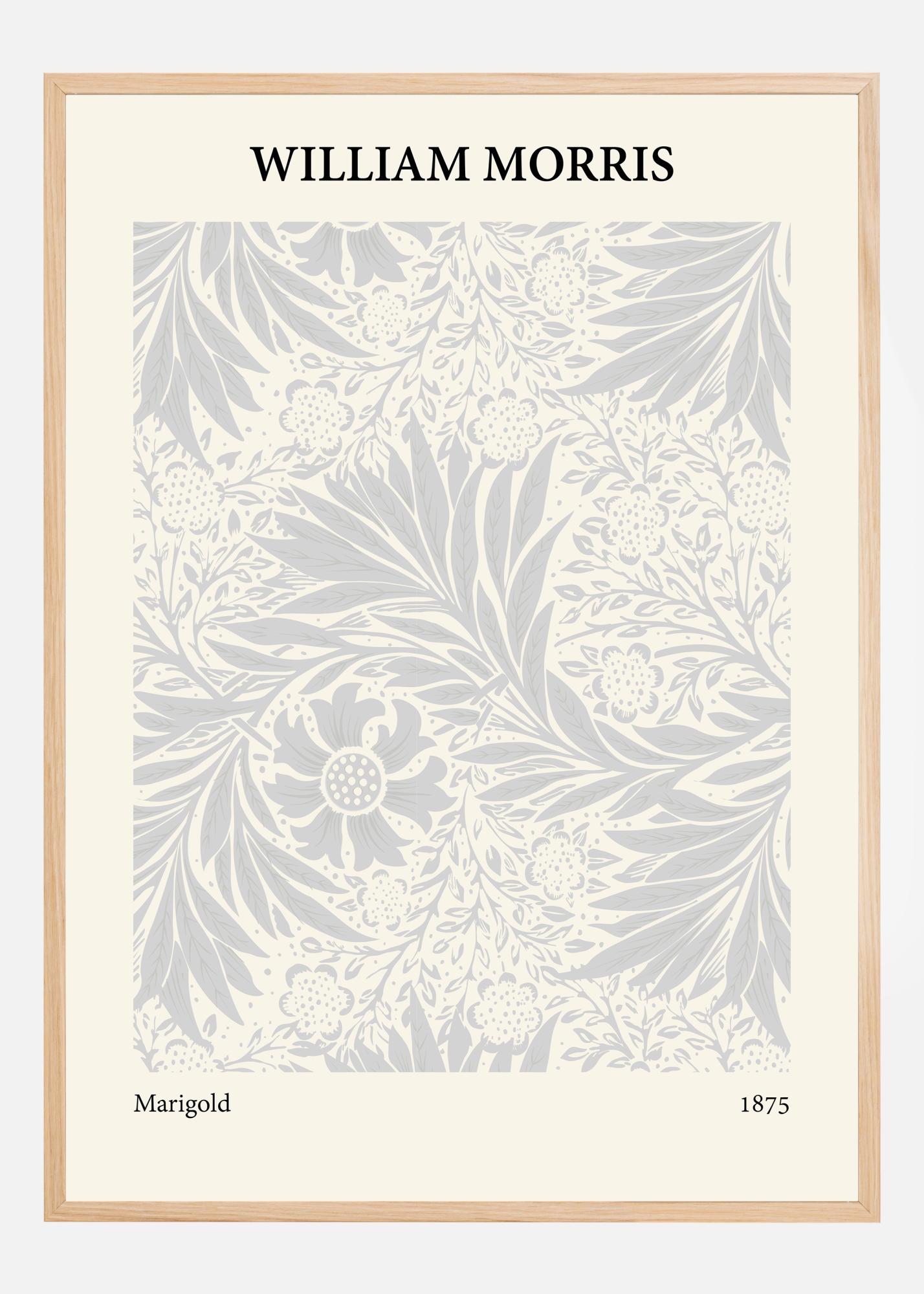Ez a poszter William Morris "Marigold" című, 1875-ös alkotásának elegáns ábrázolása, és a nyugalom és a természetes szépség érzését idézi elő. A design virágzó körömvirágokkal és finom lombozattal van tele, óvatosan elhelyezve szimmetrikus és vonzó mintázatban. A halvány szürke és fehér tónusok finom színkombinációja Morris munkájára jellemző lágy és hívogató esztétikát teremt.