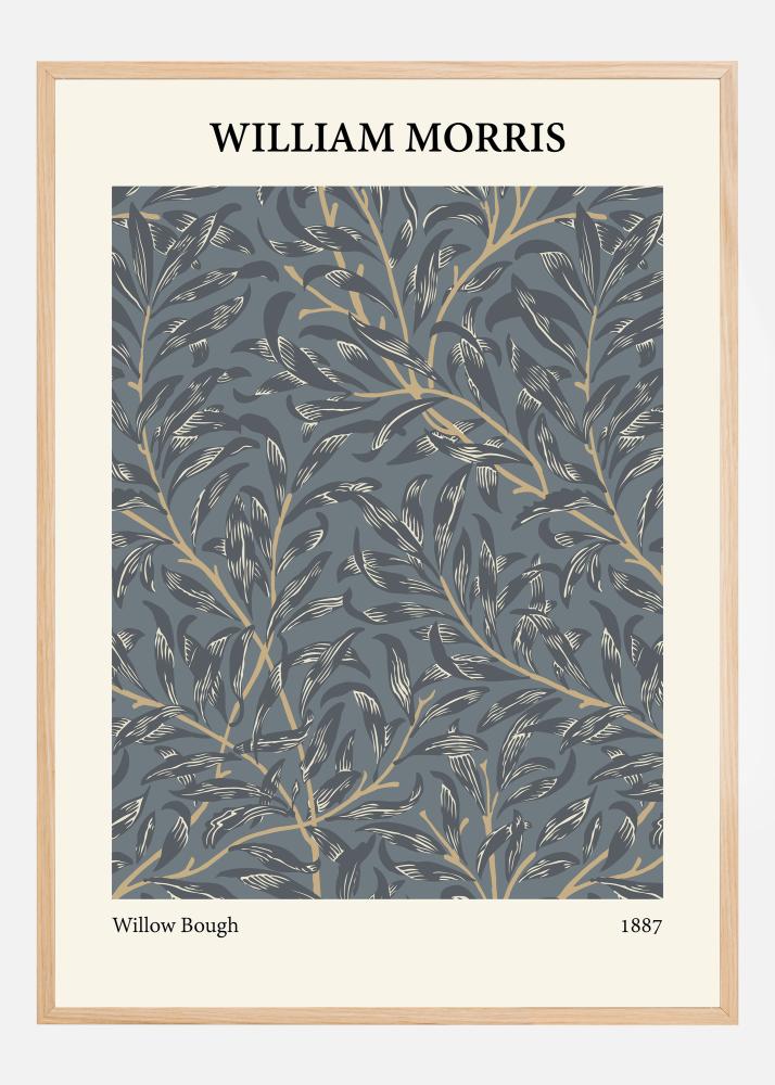 Ez egy feltűnő poszter, amely William Morris klasszikus "Willow Bough" mintáját emeli ki 1887-ből. A finoman kidolgozott fűzfalevelek kék és szürke árnyalatokban jelennek meg, melyeket elegánsan ellensúlyoznak a meleg arany tónusú vonalak. Ez a kombináció gazdagságot és mélységet kölcsönöz az összkialakításnak, és tanúbizonyságot tesz Morris mesterségéről és tartós hatásáról a mintatervezésben.