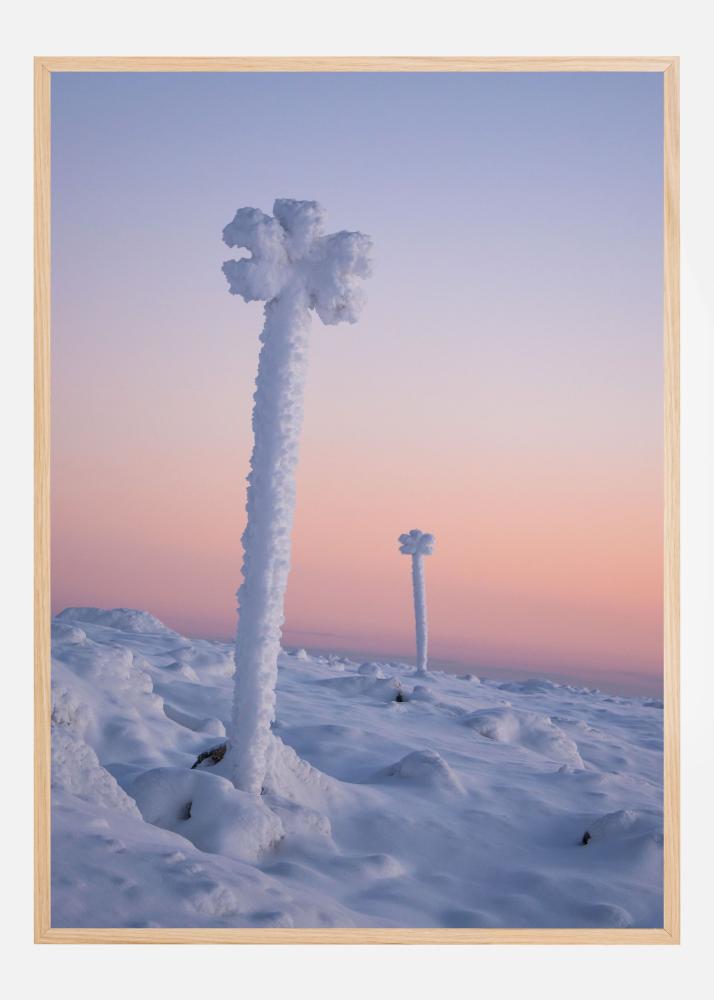 Ez a poszter egy álomszerű téli tájat ábrázol, ahol hóval borított képződmények emelkednek ki a puha, hullámzó hótakaróból. A motívumot a nyugalom és a minimalizmus jellemzi, a zúzmarás oszlopok szinte szobroknak tűnnek a természetben. Az ég gyönyörű színátmenete nyugodt és költői hangulatot kölcsönöz a képnek – tökéletes választás printként vagy plakátként, ha harmonikus és modern érzést szeretnél teremteni otthonodban.