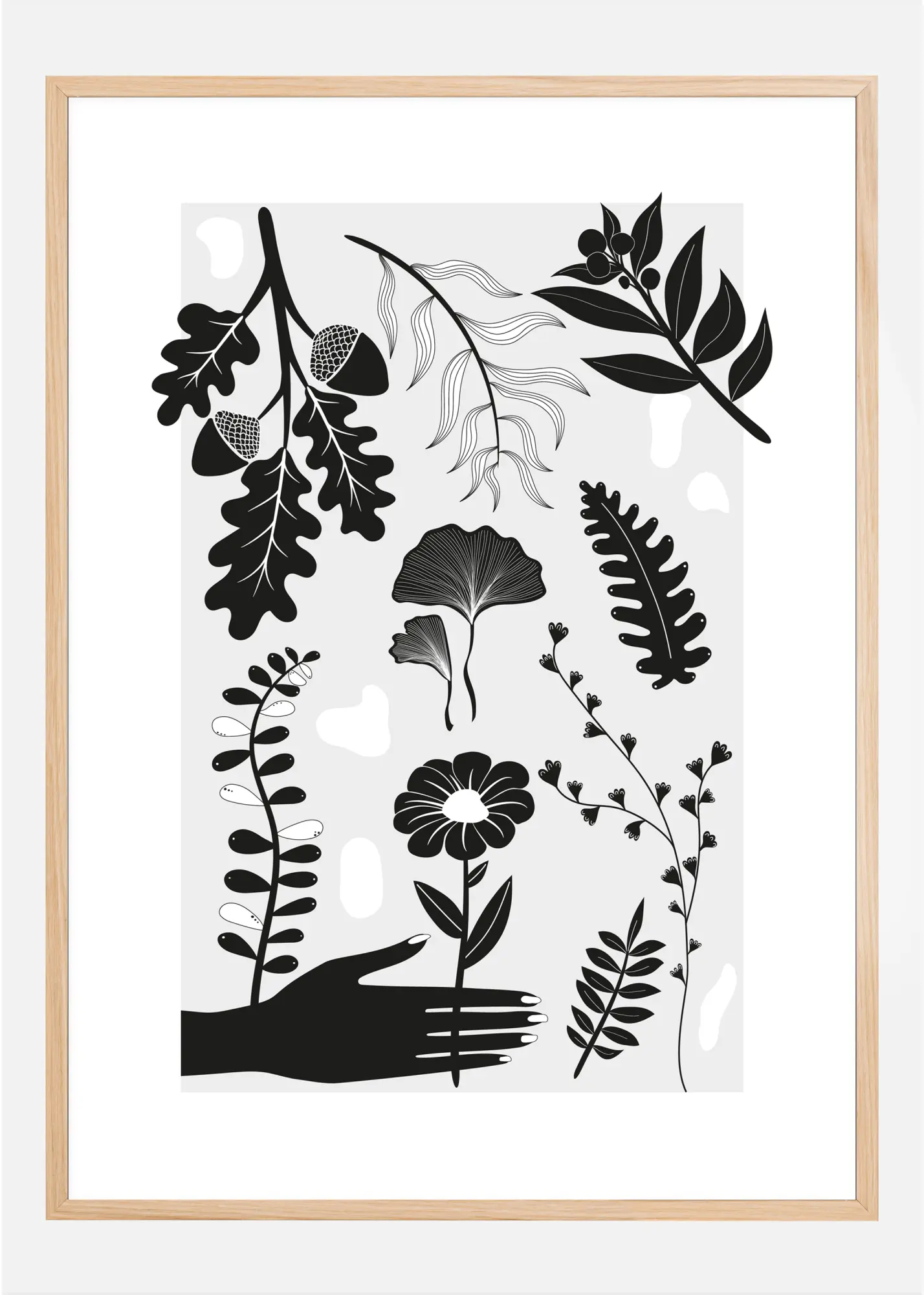 Merész poszter fekete-fehér rajzokkal különböző levelekről, növényekről és virágokról. Egy fekete kéz nyúl ki, hogy megfogjon egyet a stilizált virágok közül. Tölgyfák, virágok, páfrányok és más elemek töltik meg ezt az egyszerű, de érdekes képet. Légy botanikai hangulatban, amikor otthonodban felakasztod ezt a növényposztert.