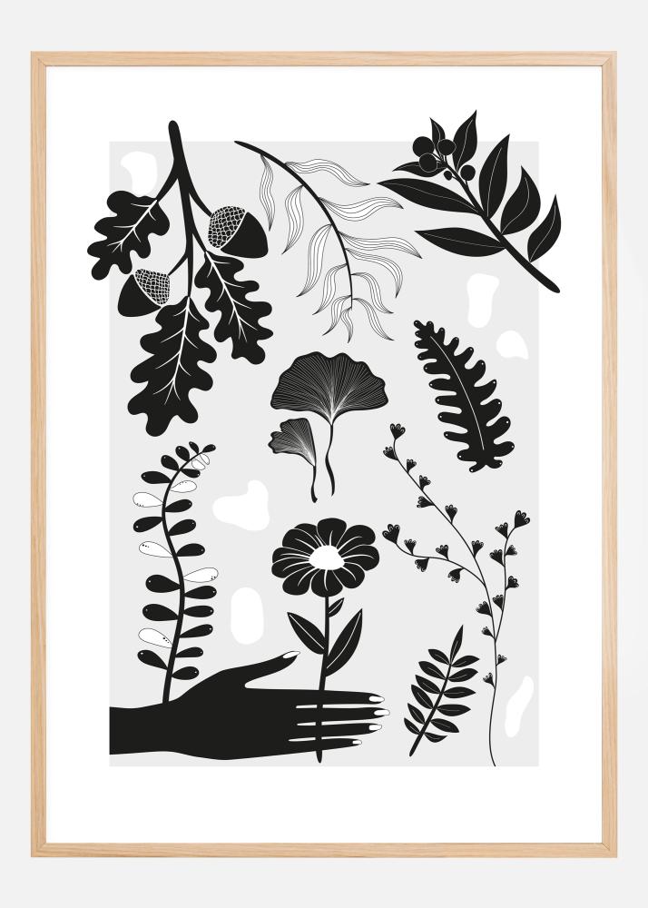Egy merész poszter különböző levelek, növények és virágok fekete-fehér figuráival. Egy fekete kéz nyúl ki, hogy megragadjon egyet a stilizált virágok közül. Makkok, virágok, páfrányok és egyéb elemek töltik ki ezt az egyszerű, mégis érdekes nyomatot. Merülj el a botanikai hangulatban, amikor otthonodban felakasztod ezt a növényi posztert.