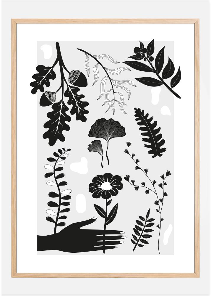 Egy merész poszter fekete-fehér figurákkal különböző levelekről, növényekről és virágokról. Egy fekete kéz nyúl ki, hogy megfogjon egyet a stilizált virágok közül. Makkok, virágok, páfrányok és egyebek töltik meg ezt az egyszerű, de érdekes nyomatot. Hozz magad botanikai hangulatba, amikor felakasztod ezt a növénymotívumú posztert otthonodban.