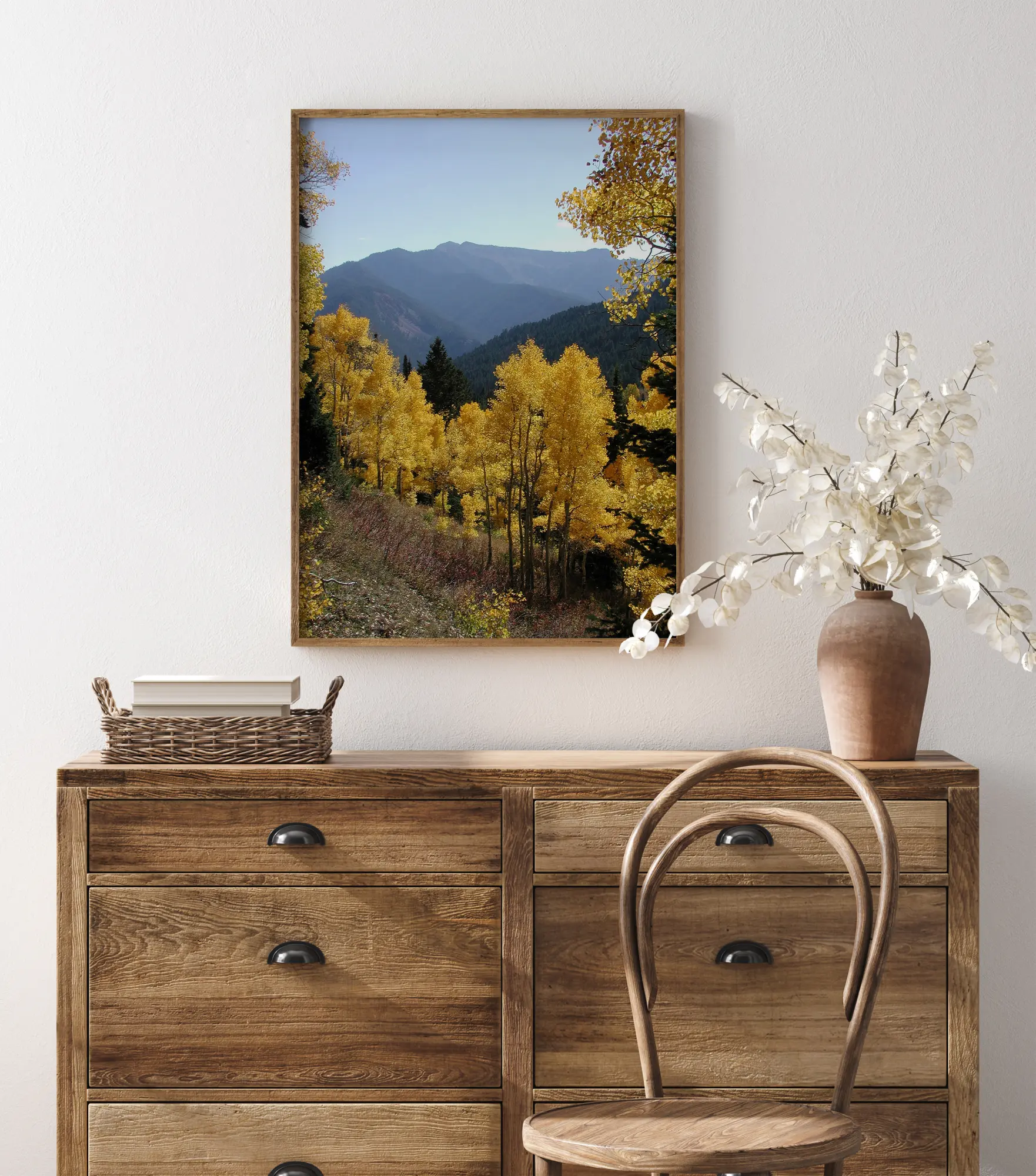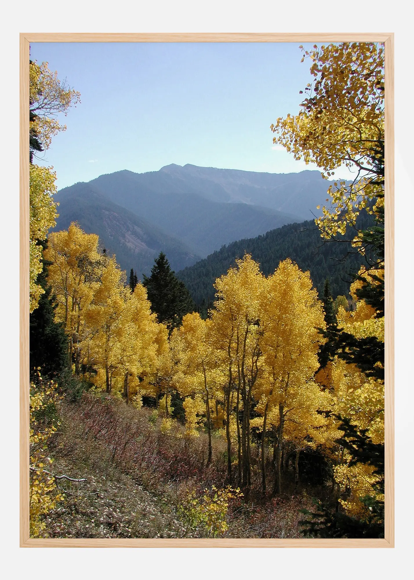 Egy világos tájképnyomat sárga fákkal, mögöttük egy kék hegylánccal. A sárga fák igazi késő nyári érzést keltenek, ahogy megvilágítják ezt az erdei jelenetet. Érezze a meleg szellőt a hegy fölött ezen a korai őszi képen.