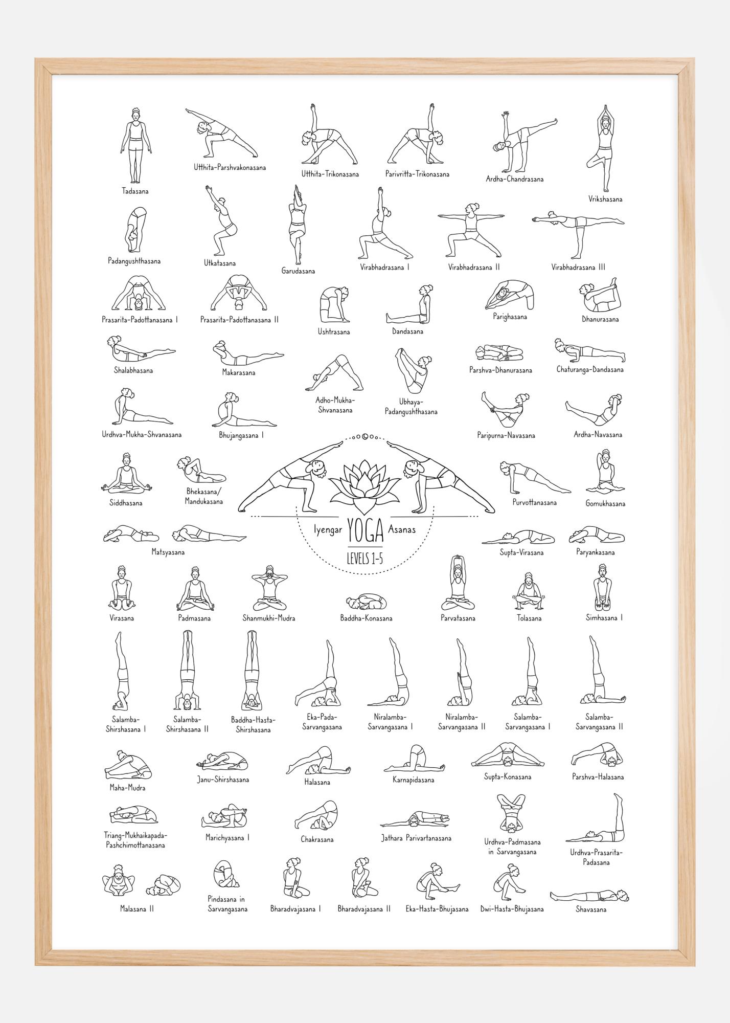 A poszter központi része az Iyengar Jóga Ászanákra van szentelve az 1-5 szinteken, ami a gyakorlat előrehaladását jelzi. Ez a nyomat nemcsak funkcionális, hanem esztétikailag is vonzó, így kiválóan alkalmas egy jógastúdióba, egy otthoni edzőterembe, vagy inspiráció forrásaként a lakás egy pihentető szegletében. Minimalista fekete-fehér dizájnja kompatibilis különféle belsőépítészeti stílusokkal, miközben nyugalmat és fókuszt sugároz.