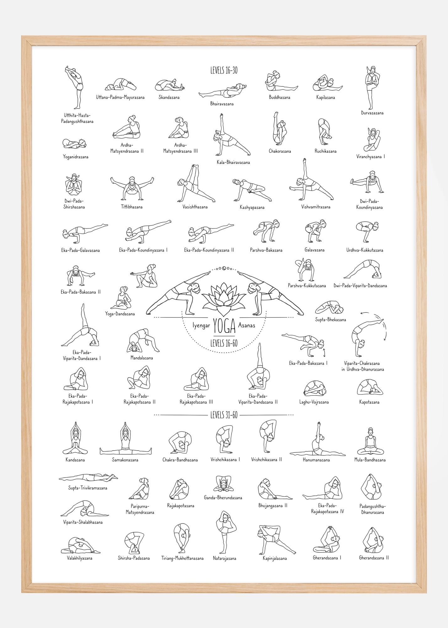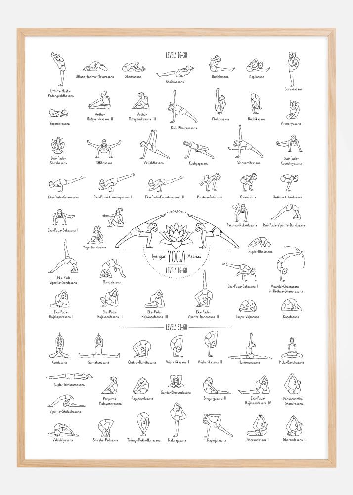 Ez az átfogó és részletes poszter a különböző jógaászanákat ábrázolja, melyek középhaladó és haladó gyakorlók számára alkalmasak. Minden pozíció pontosan van rajzolva egyszerű vonalművészettel, ami megkönnyíti a néző számára minden póz formájának és irányának megértését. Az ászanák nehézségi fok szerint oszlopokba vannak rendezve, 16-tól 30-ig terjedően, és minden póz világosan meg van jelölve hagyományos szanszkrit nevével.
