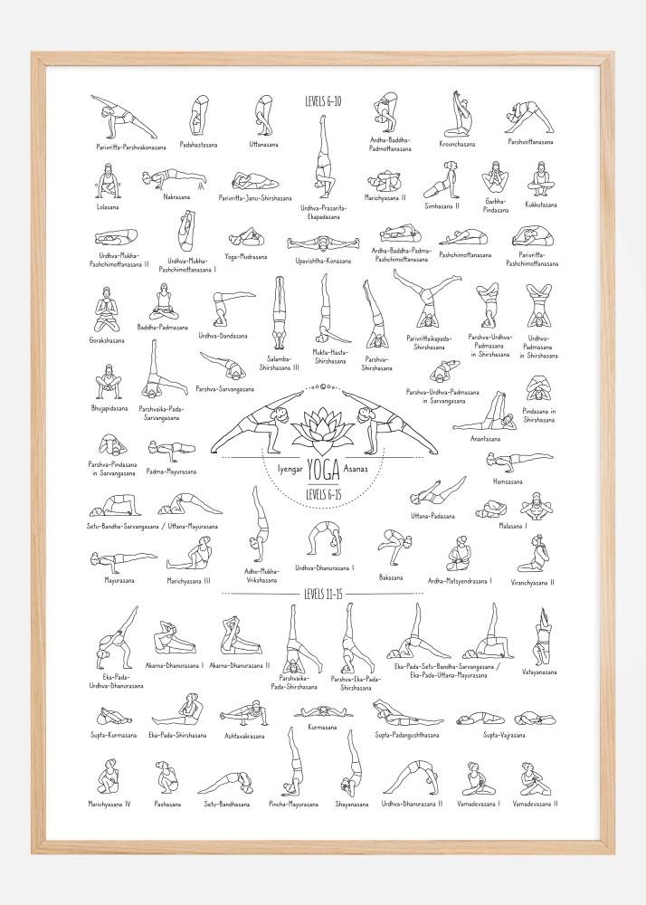 Ez az átfogó és oktató poszter vizuális útmutatót nyújt az Iyengar Jóga Ászanákhoz a 6-tól 15-ig terjedő szintekre, egyértelmű és módszeres elrendezésben bemutatva. A részletes illusztrációk precíz vonalakkal vannak megrajzolva, amelyek kiemelik az egyes jóga pózok egyedi formáit és testtartásait. Minden kép fölött a szanszkrit nevét találjuk az ászanának, ami megkönnyíti a különböző szintű gyakorlók számára a pozíciók azonosítását és gyakorlását.