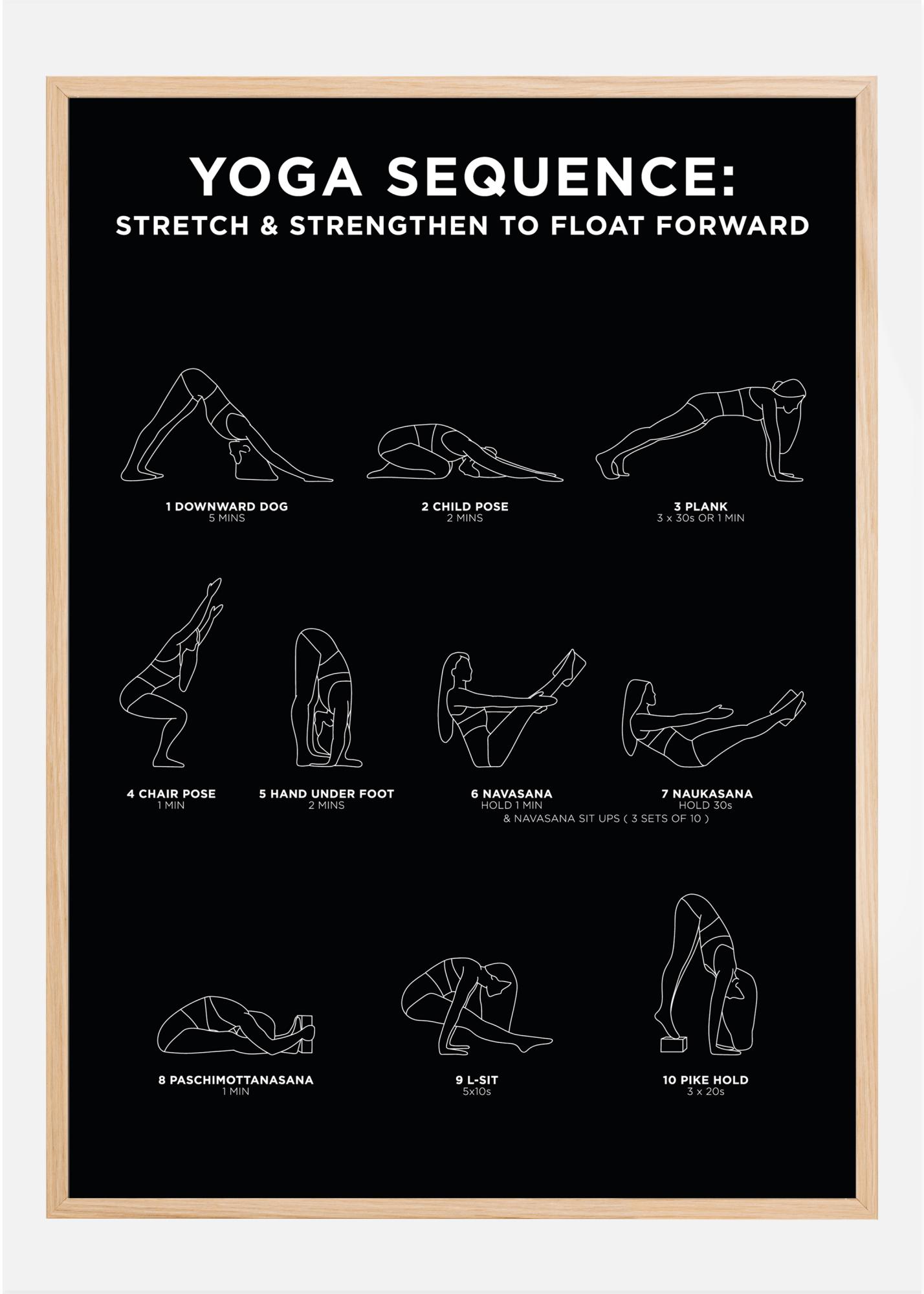 Ez a poszter letisztult és egyszerű dizájnnal rendelkezik, ugyanakkor nagyon hasznos, ha szeretnél jógát tanulni, amely a nyújtásra és erőre összpontosít. A poszter ugyanis egyértelműen bemutatja, hogyan kell végrehajtani a pozíciókat egy jógaszekvenciában, valamint mennyi ideig kell tartani minden pozíciót.