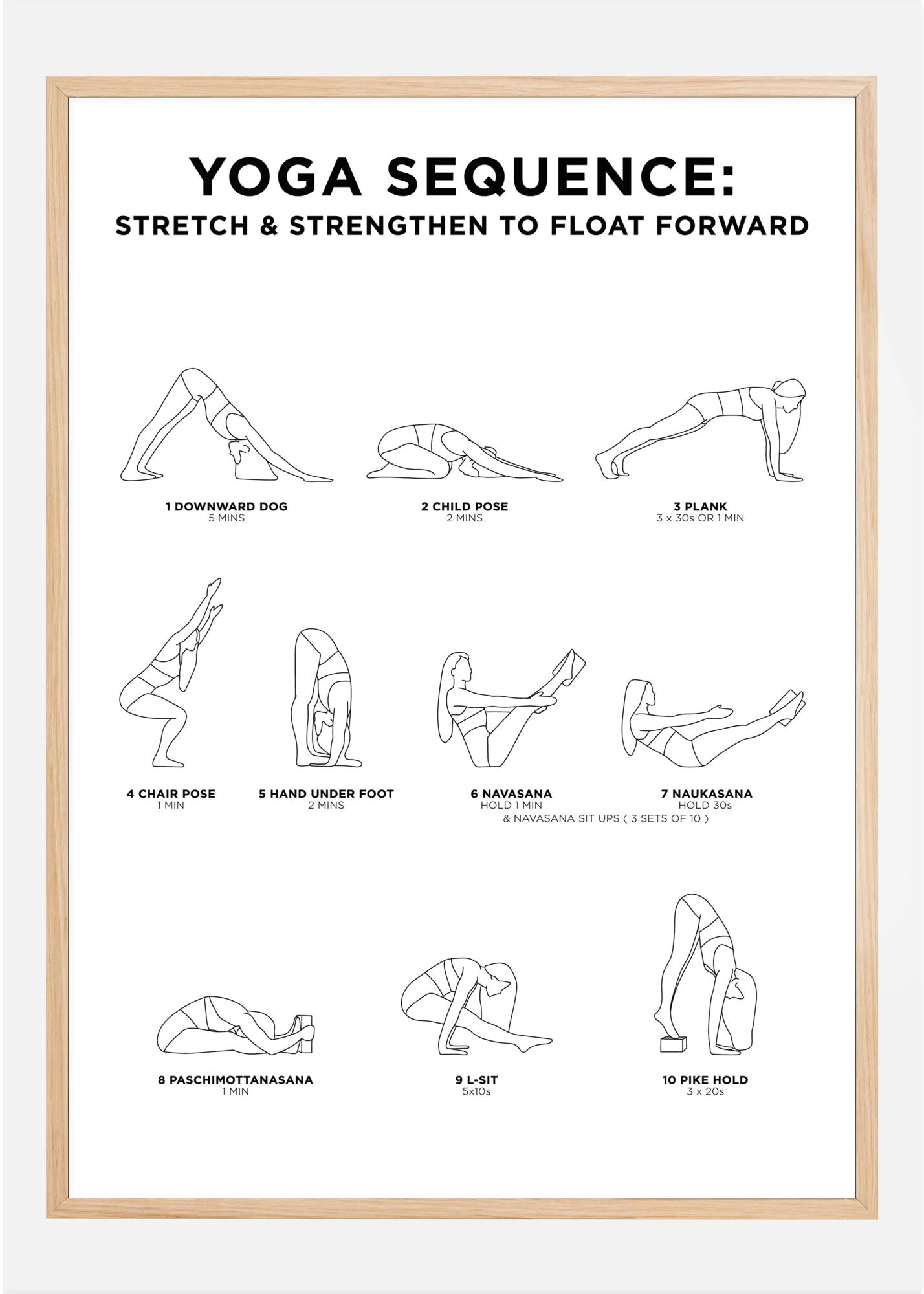 Ez a poszter letisztult és egyszerű dizájnnal rendelkezik, de nagyon hasznos is, ha meg szeretnél tanulni jógázni, a nyújtásra és az erőre koncentrálva. A poszter világosan megmutatja, hogyan kell végrehajtani a pozíciókat egy jógasorozatban, valamint azt is, hogy meddig kell tartani minden egyes pozíciót.