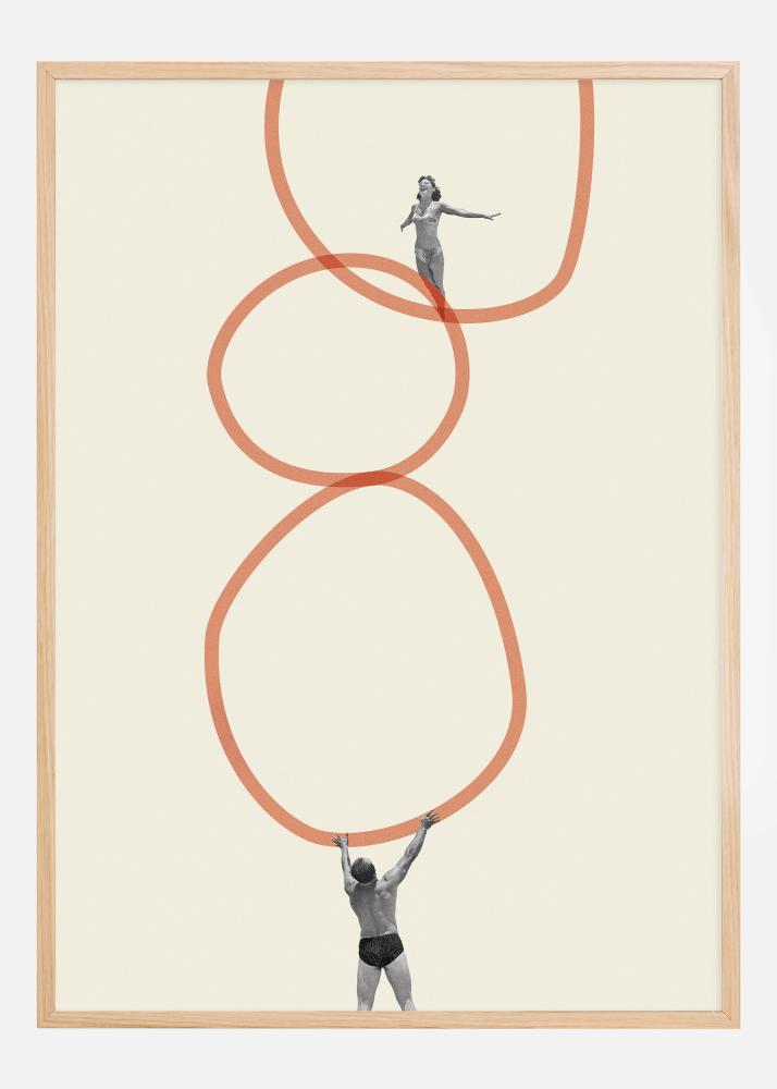 Ez az egyedülálló poszter egy olyan kompozíciót mutat be, amely emlékeztet a kontúrok és az emberi interakció táncára. A képen egy személy látható egy lendületes mozdulatban, amelyet egy másik figura ellensúlyoz, aki erősen és szilárdan áll a földön, mindkettőt lebegő terrakotta-vörös körök keretezik, amelyek mozgás és kontinuitás érzetét keltik.