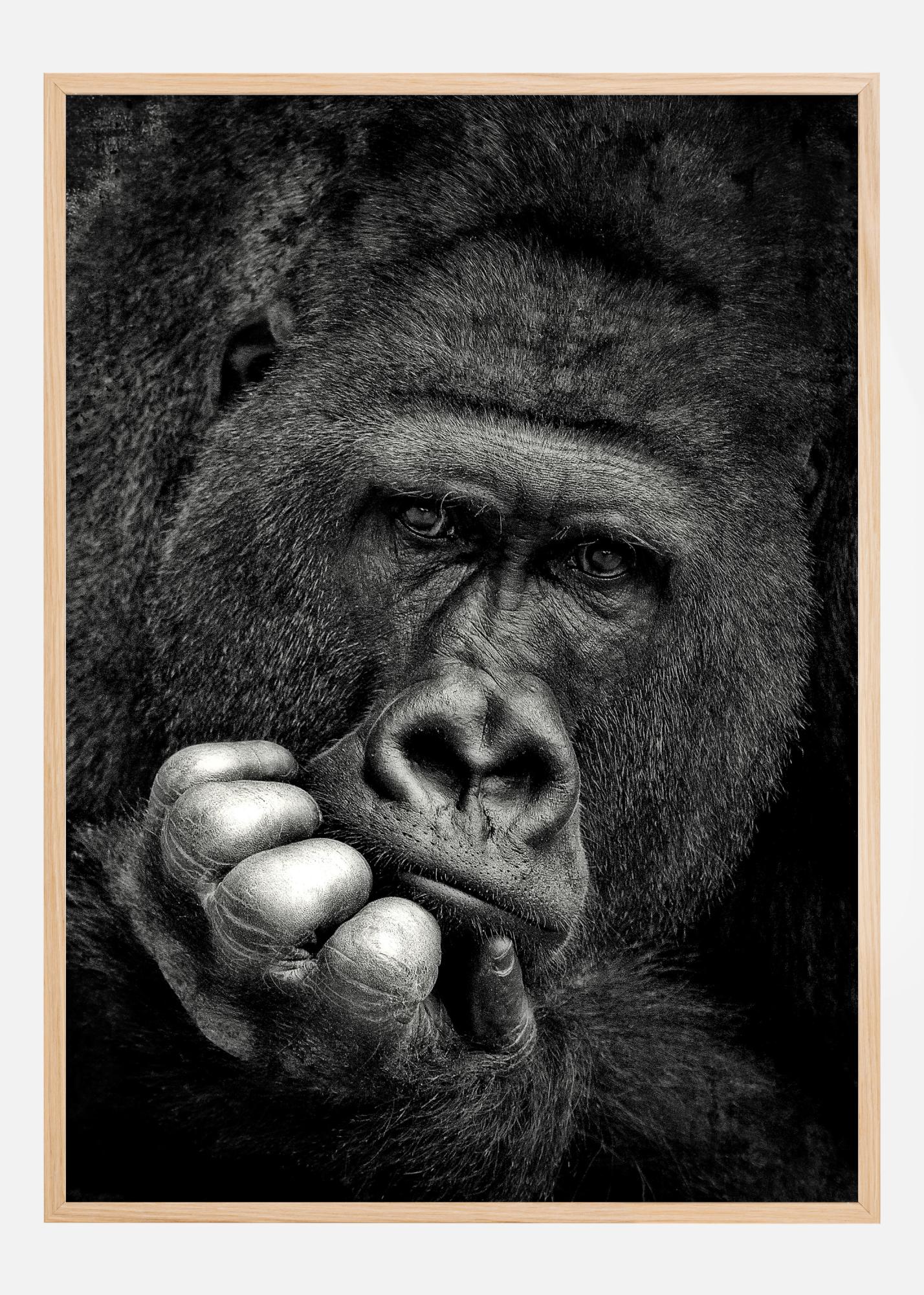Egy fantasztikus portréposzter egy gorilláról elmélkedő pózban. A gorilla hosszan néz a kamerába. Az egyik keze az álla alatt van, mintha fontos kérdéseken gondolkodna. A fekete-fehér nyomat kiemeli ennek a hihetetlen emberszabású majomnak az arcának minden részletét.