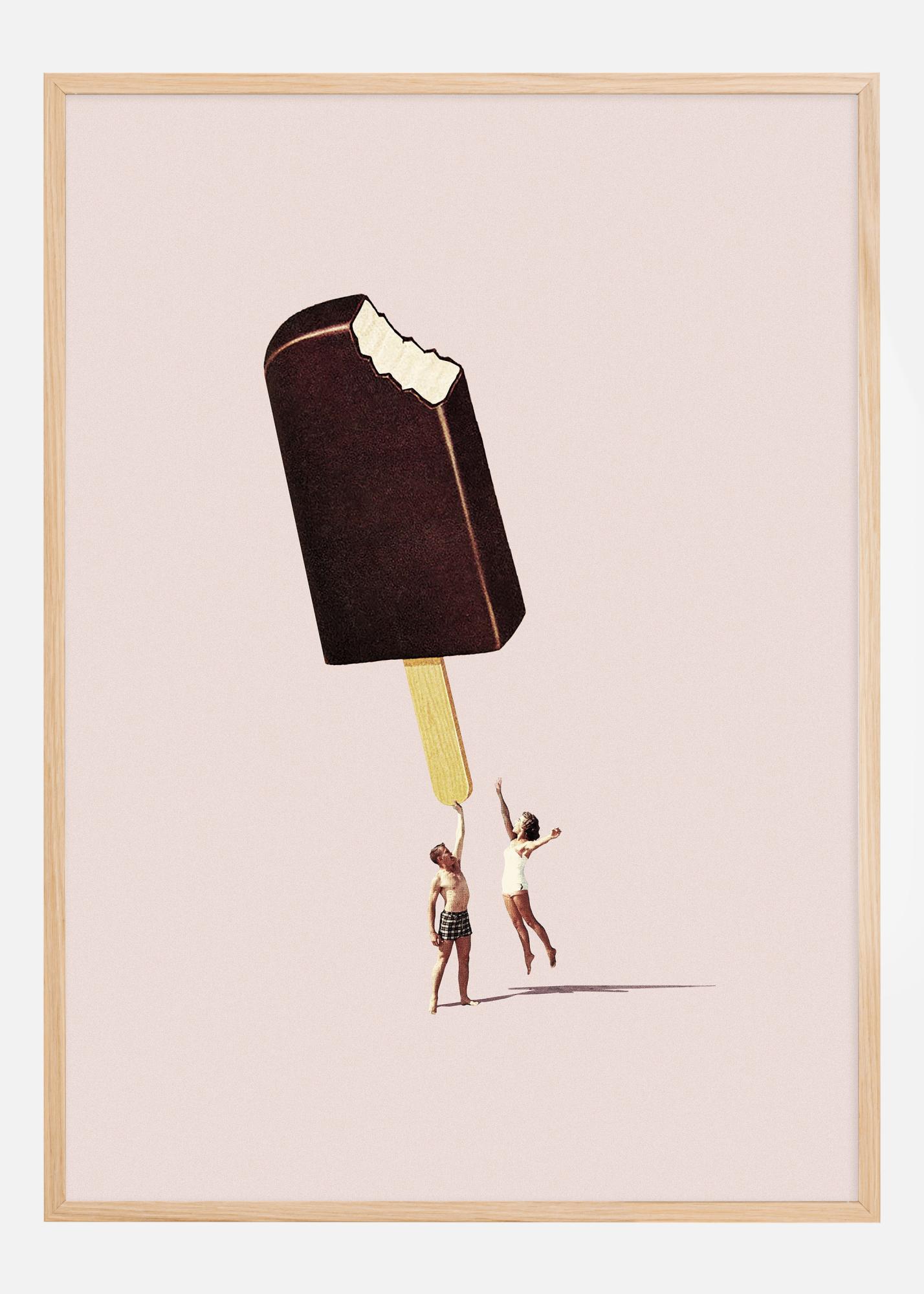 Ez a bájos poszter egy egyedi és játékos képet mutat be két emberről, akik úgy tűnik, hogy találtak egy gigantikus jégkrémes pálcikát! A fantáziadús kompozíciójával és meleg pasztellrózsaszín hátterével ez a kép a nyári öröm és nosztalgia érzését kínálja. A vidám figurák, akik egyszerű fürdőruhákba vannak öltözve, elérnek a jégkrémes pálcika felé, amely valósághű megjelenéssel bír egy kiharapott résszel, ami csodálatos kontrasztot teremt a minimalista környezettel. Ez a kreatív és élénk jelenet megragadja a néző figyelmét, és felidézi a napos napok emlékeit.