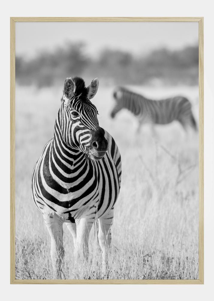 Egy állatos poszter egy zebrával az afrikai síkságon. Egy merész zebra őrségben áll az előtérben, míg egy másik a távolban halad. Utazz Afrikába minden nap, miközben belemerülsz ebbe a békés nyomatba.