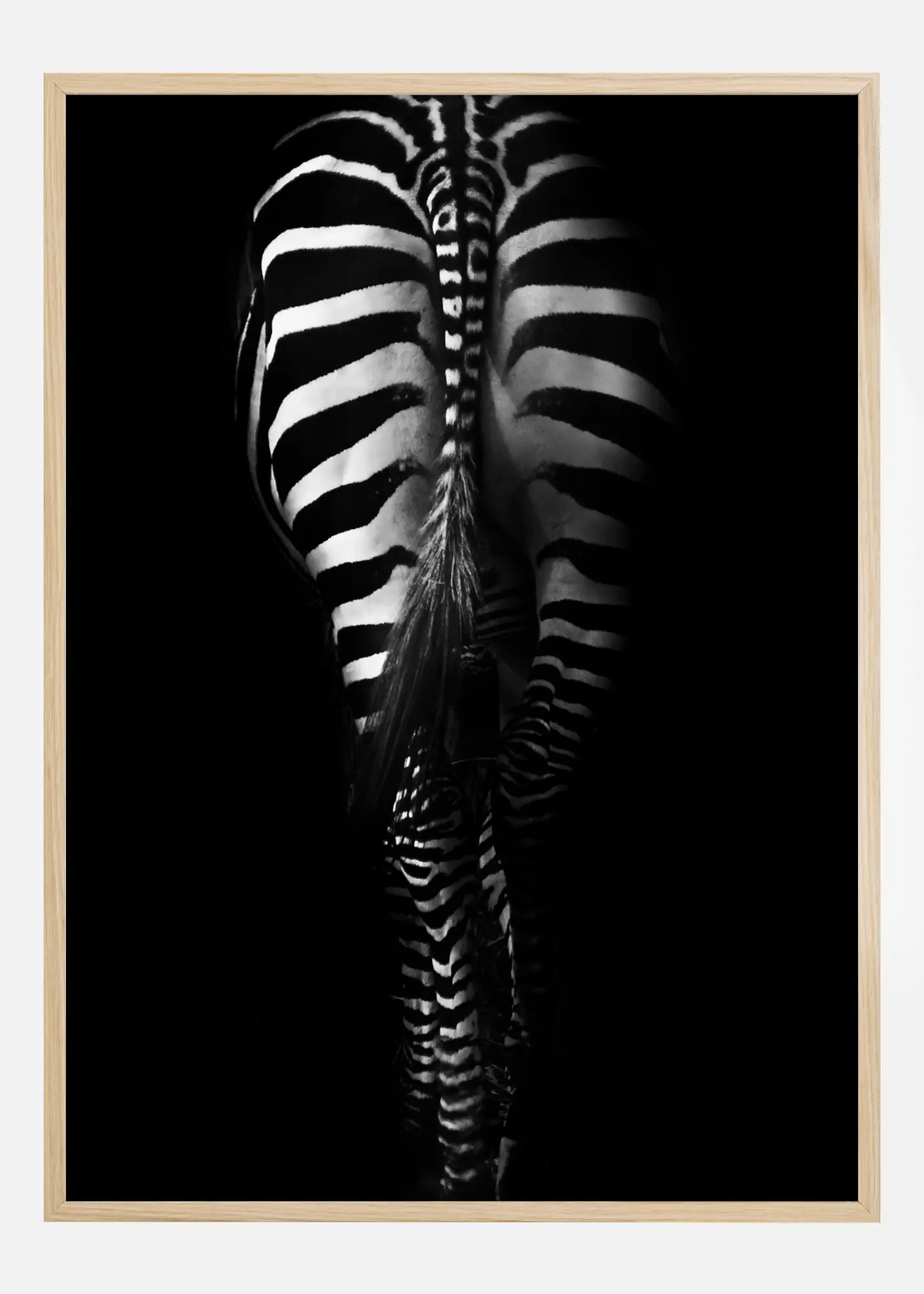 Egy állatposzter egy zebra hátuljáról. A zebra farka és hátsója kiemelkedik a fekete háttérből, amikor lépéseket tesz, hogy elinduljon. A vastag fehér csíkok a farokhoz vonzzák a tekintetet, amely úgy tűnik, hogy oldalra lendül, amikor lép egyet. Élvezze ezt a különlegesebb képet egy zebráról.